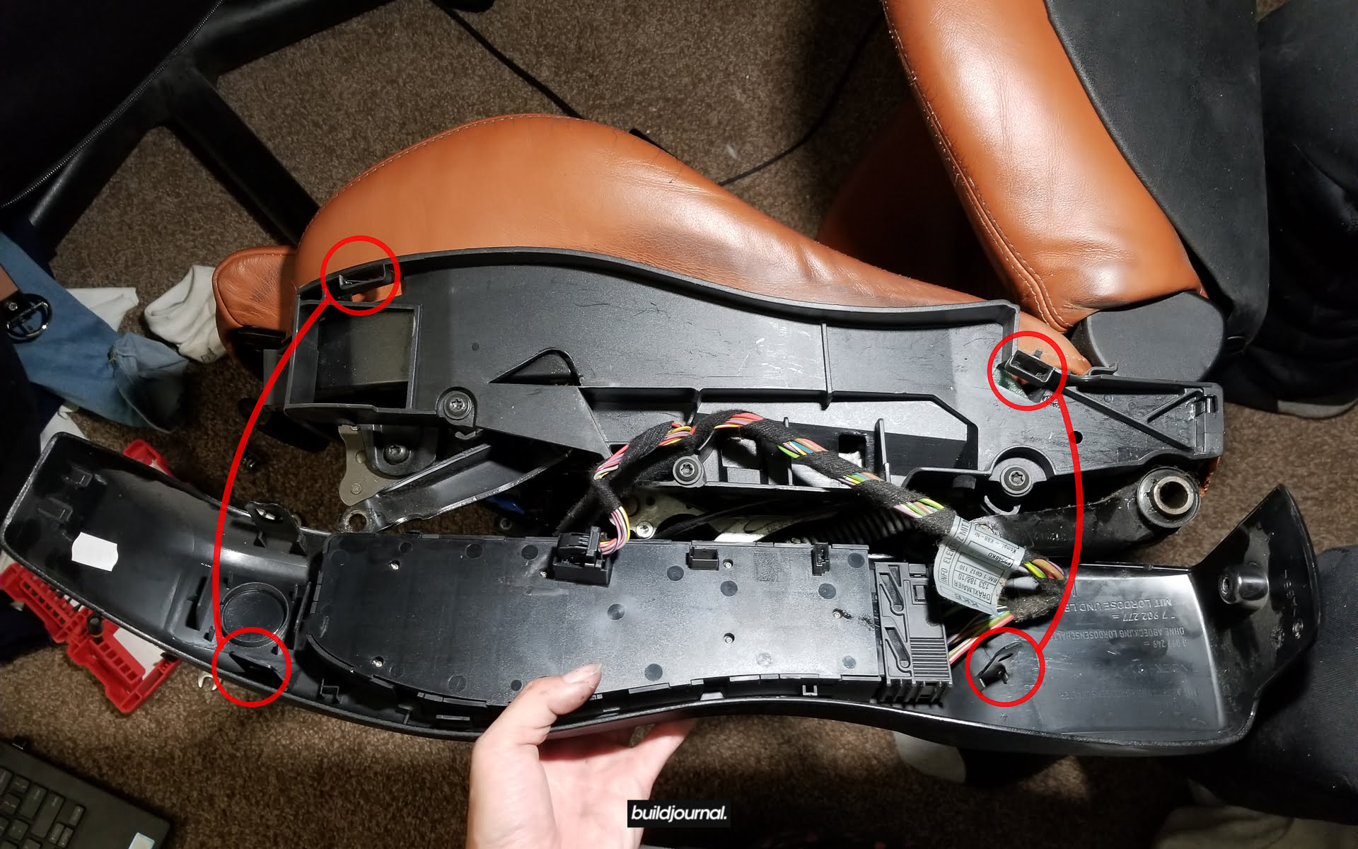 2.3 – Remove the plastic cover over the seat controls. These are held on together by a total of 6 tabs. 4 of them are fairly obvious on the bottom circled here. You can ignore the small tabs in the middle if you want – these are separate to the cover and technically don’t need to be removed.