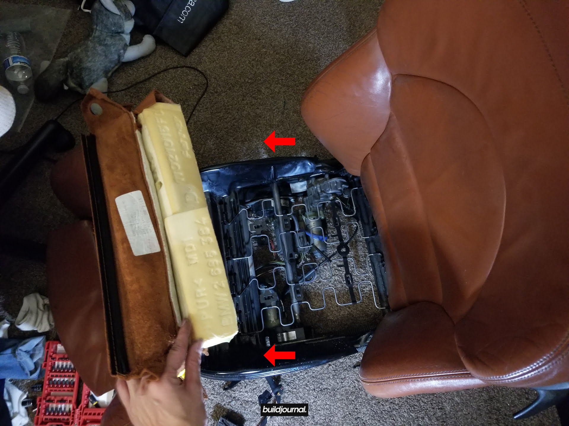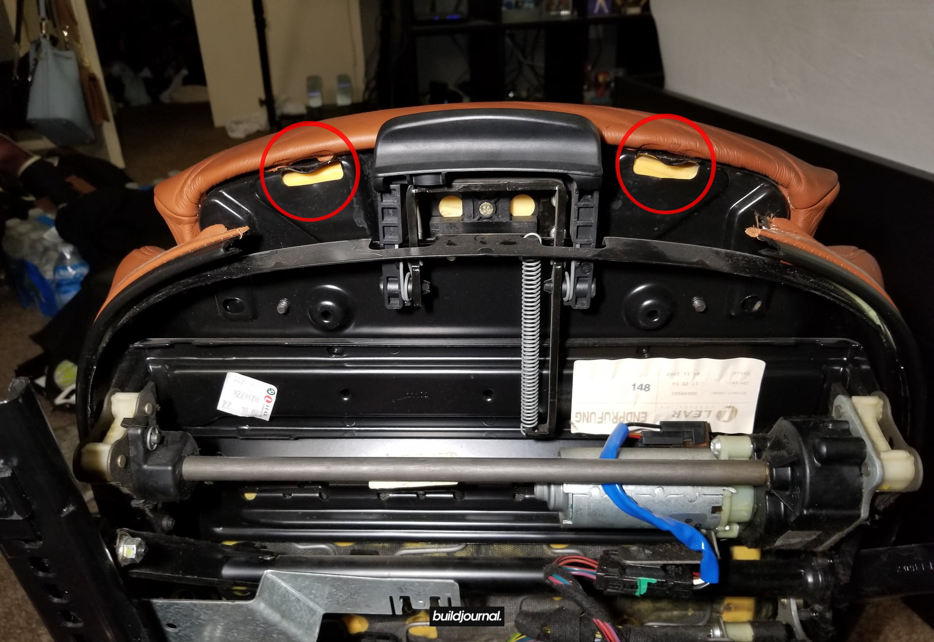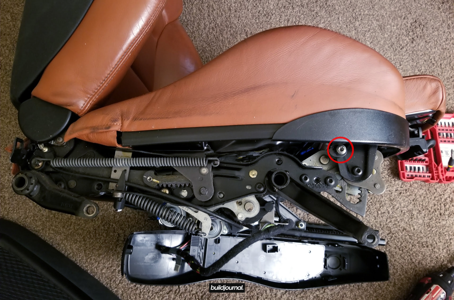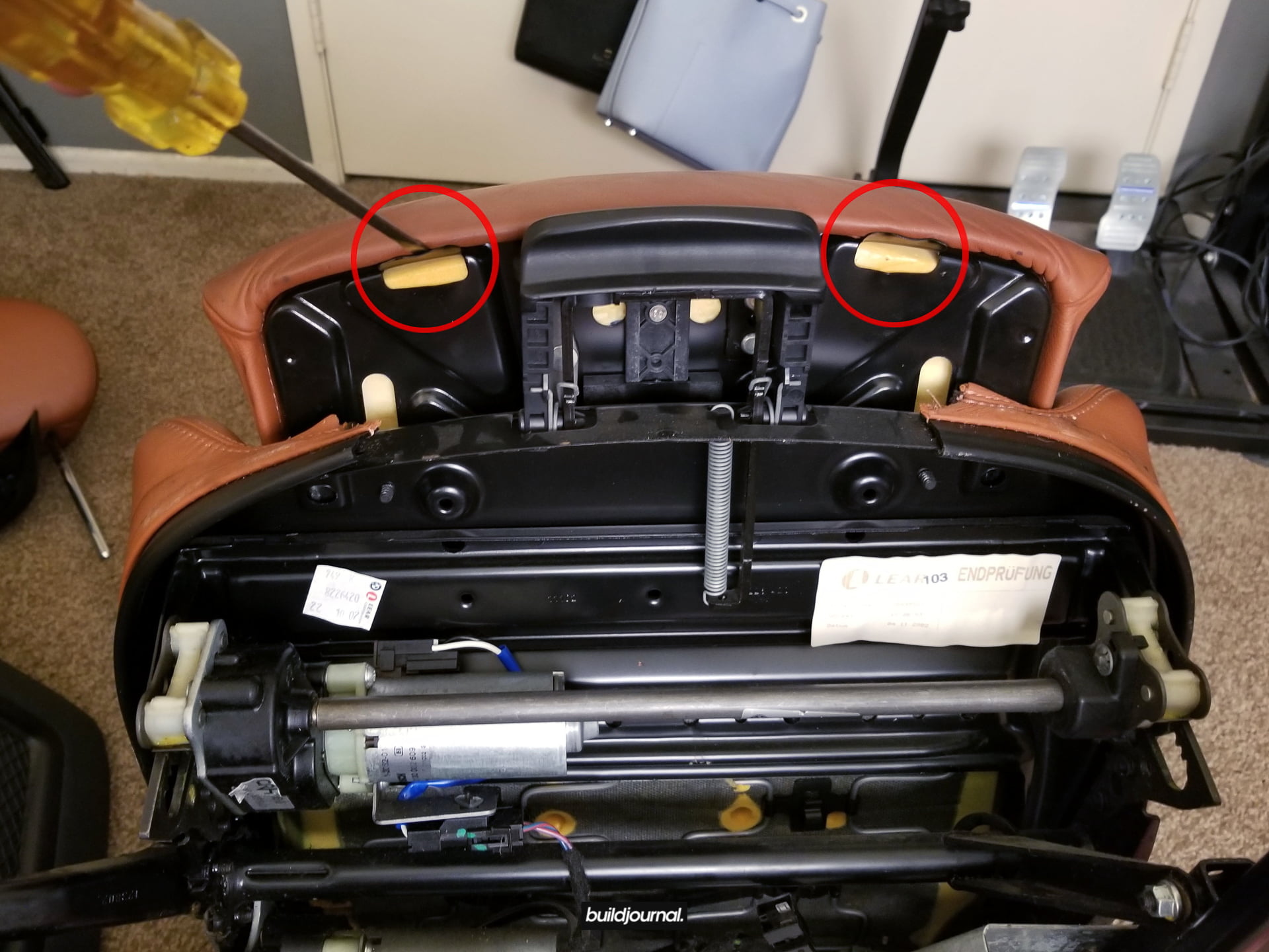 Since Andrew (the Buildjournal Alpine White M3) stripped his interior for weight savings, I took the rare opportunity to replace my Napa black interior for his cinnamon interior. Only issue was that his front seats have power bases, and I wanted to keep my manual bases. As a result, I ended up pulling off all four of the leather and foam assemblies and swapping them to different bases.