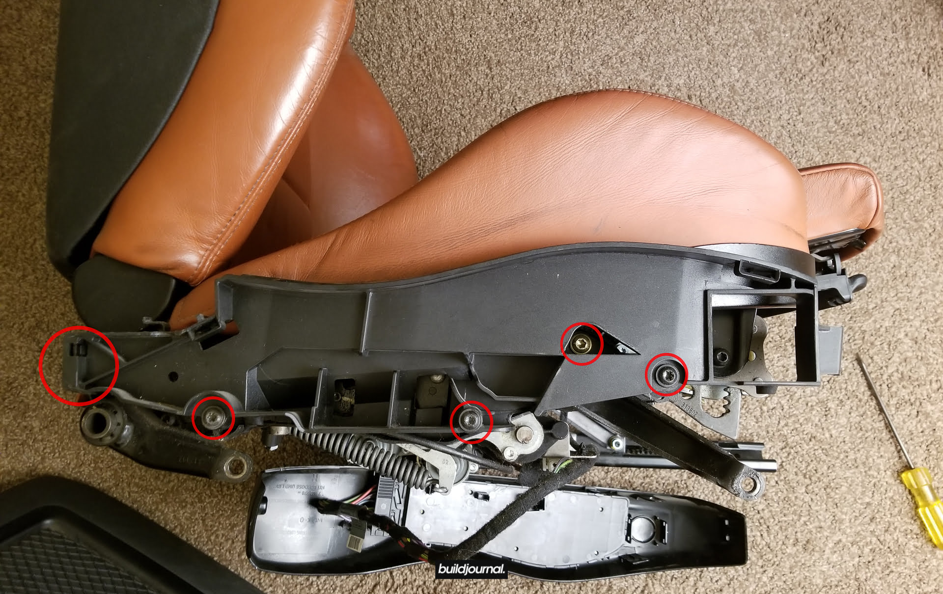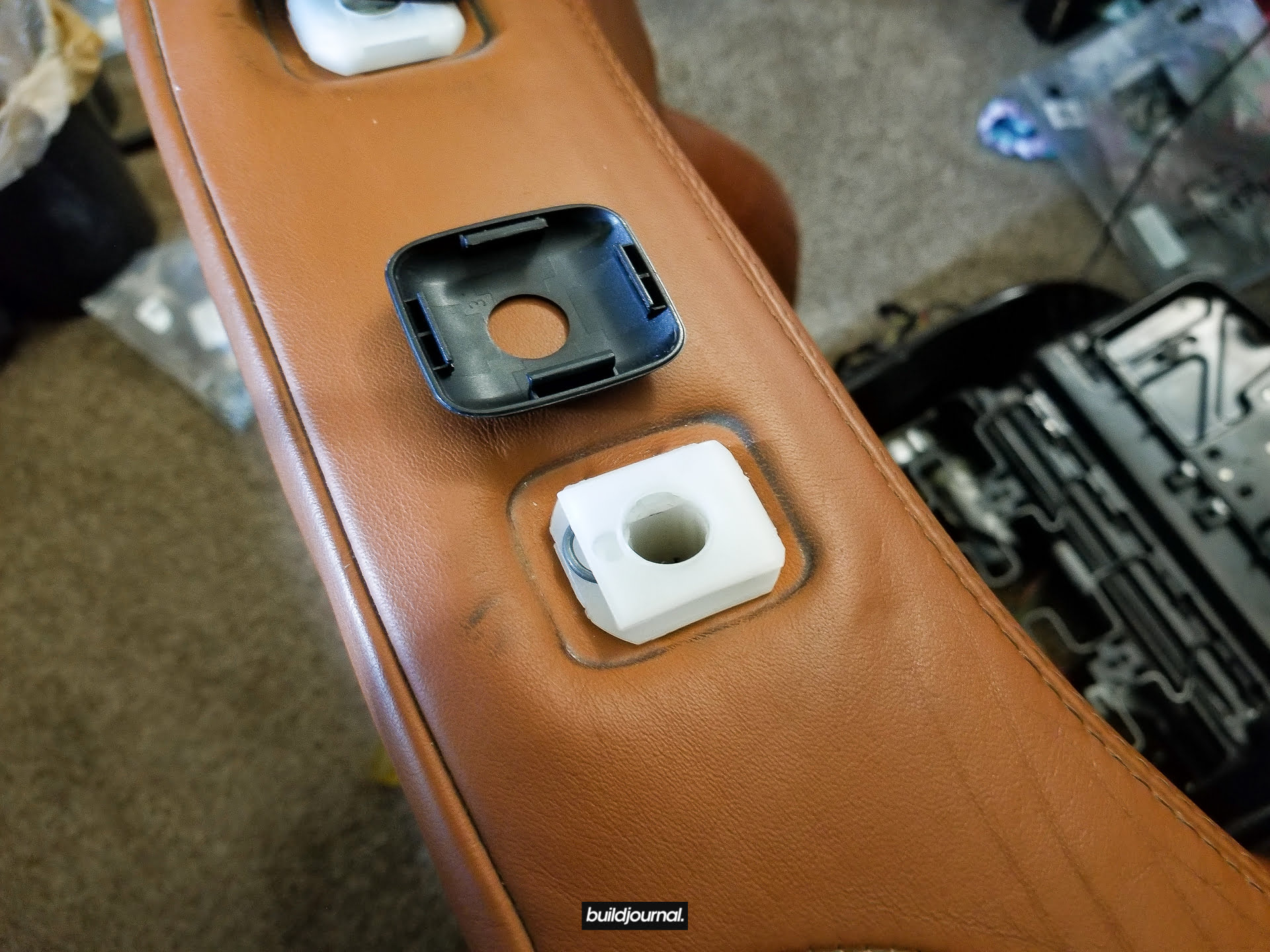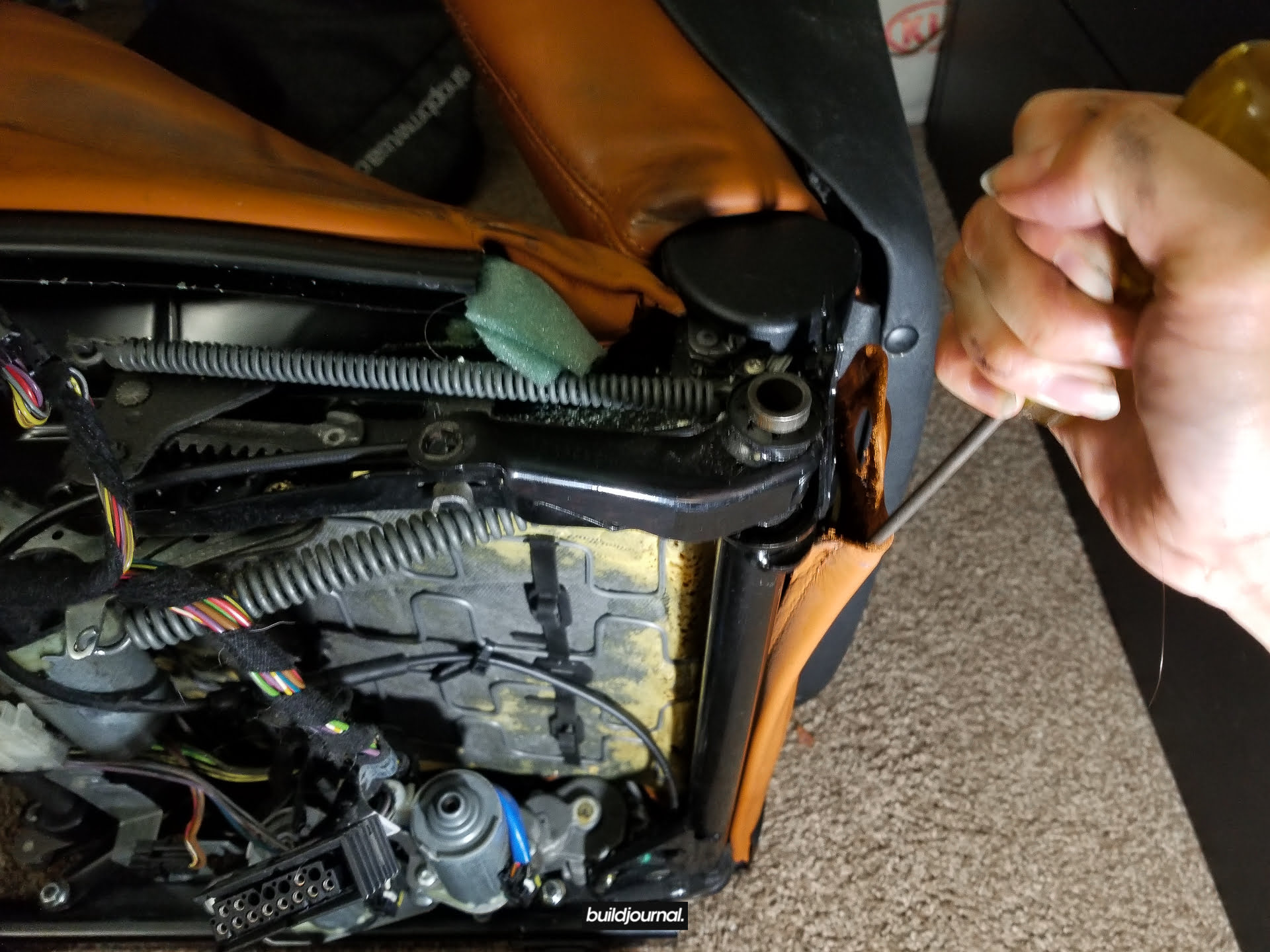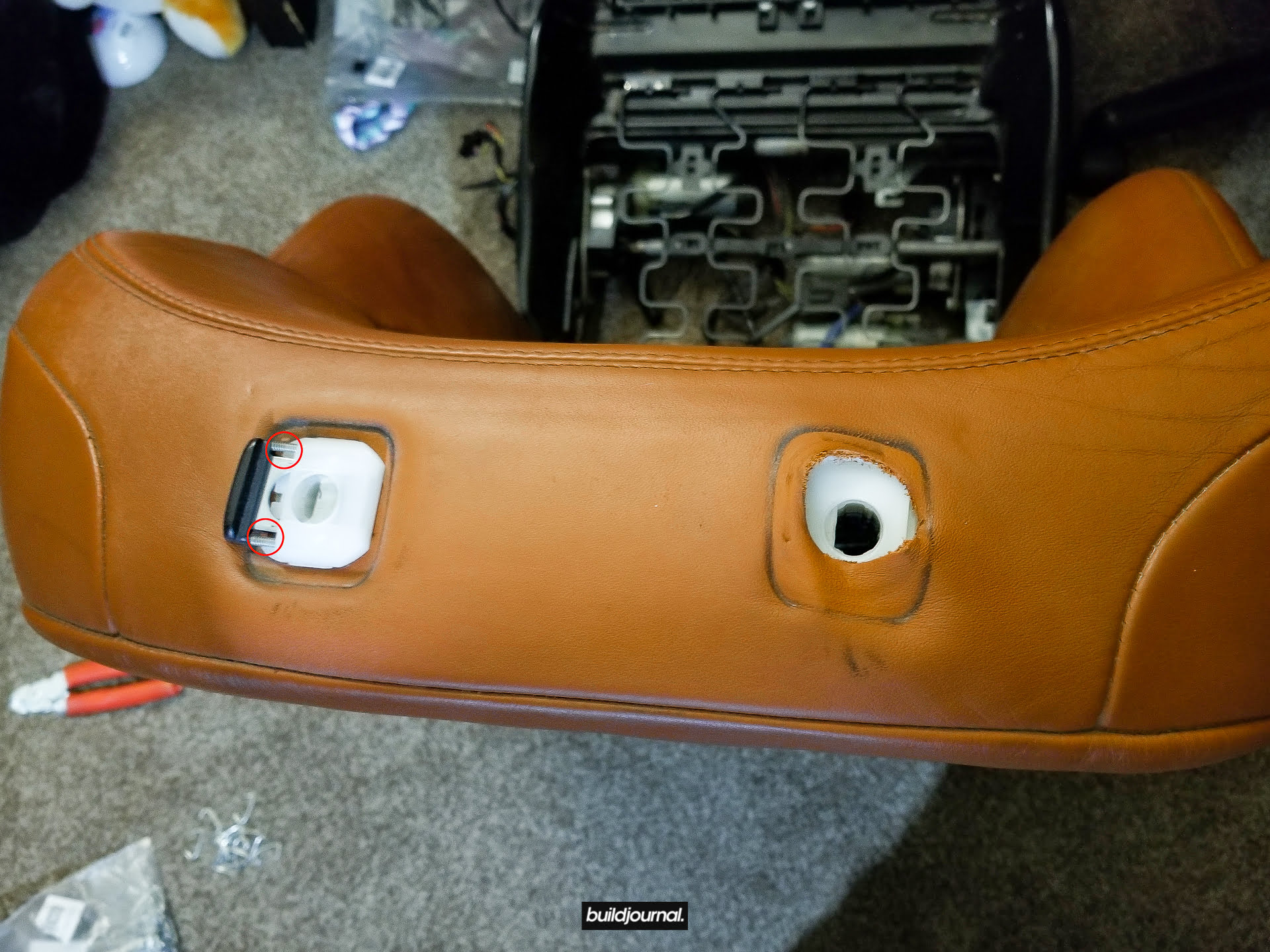 Since Andrew (the Buildjournal Alpine White M3) stripped his interior for weight savings, I took the rare opportunity to replace my Napa black interior for his cinnamon interior. Only issue was that his front seats have power bases, and I wanted to keep my manual bases. As a result, I ended up pulling off all four of the leather and foam assemblies and swapping them to different bases.