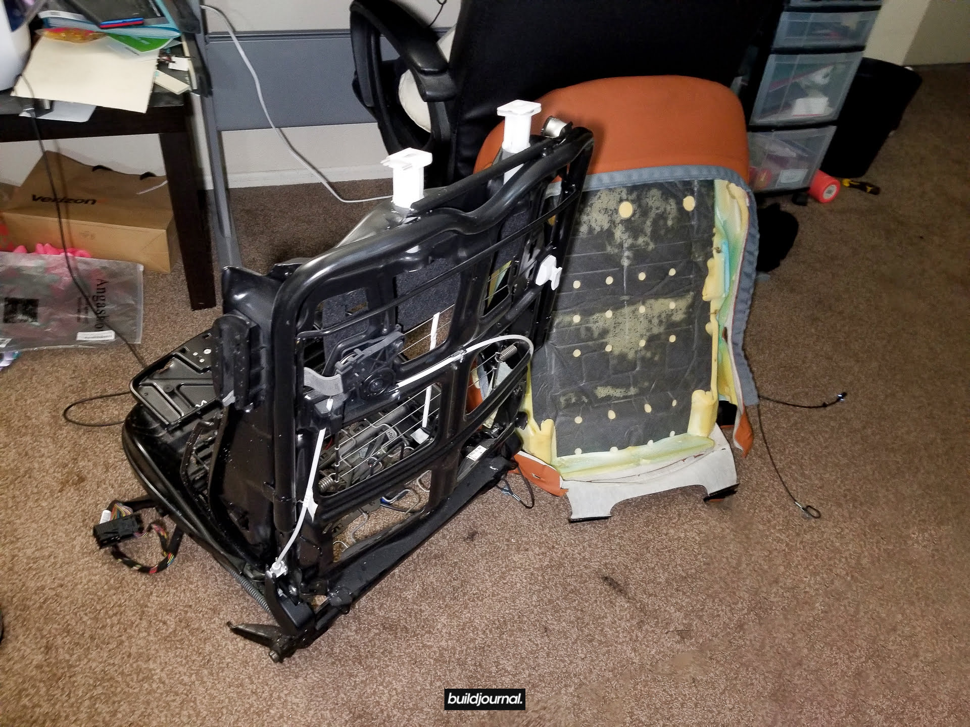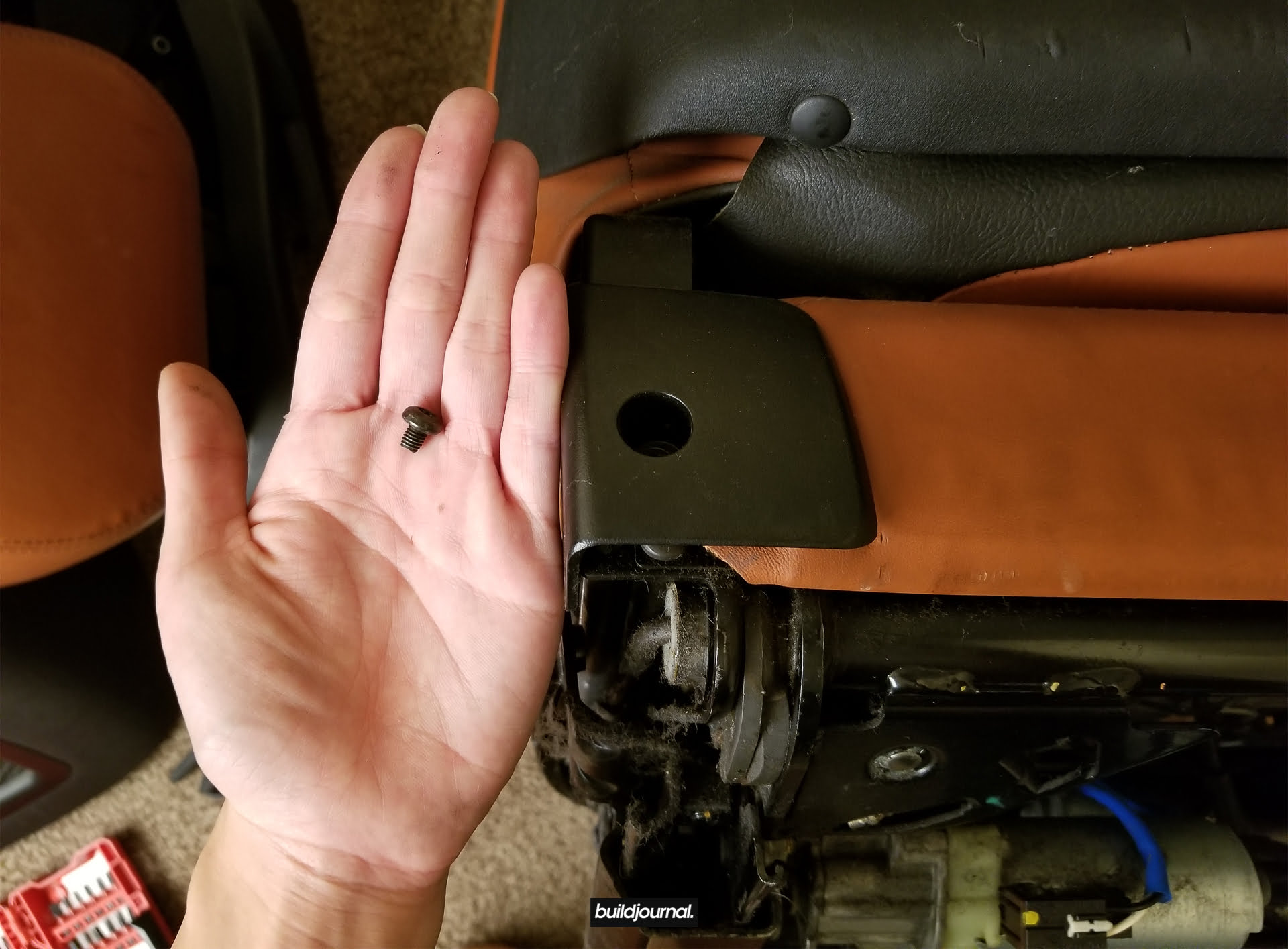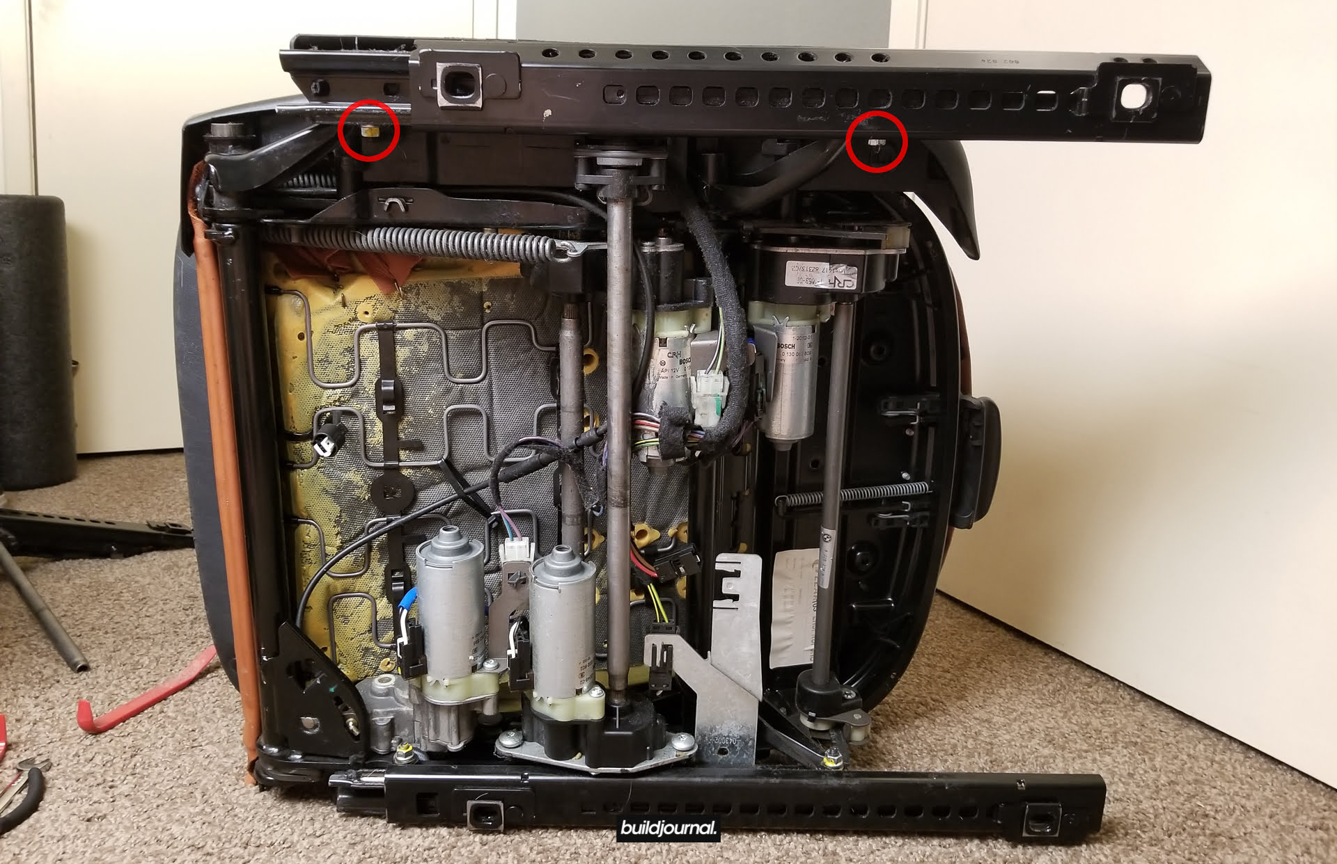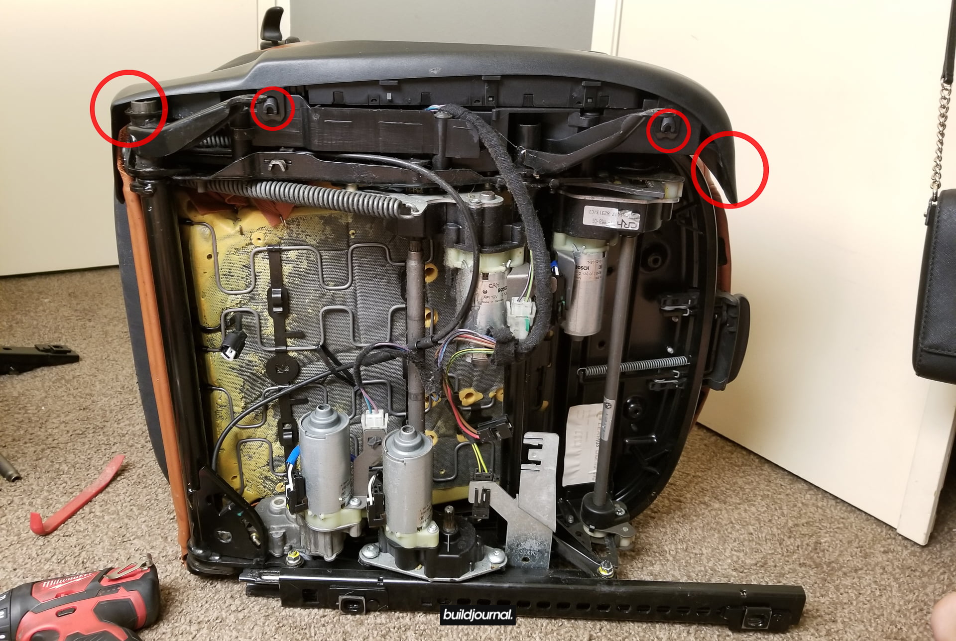 Since Andrew (the Buildjournal Alpine White M3) stripped his interior for weight savings, I took the rare opportunity to replace my Napa black interior for his cinnamon interior. Only issue was that his front seats have power bases, and I wanted to keep my manual bases. As a result, I ended up pulling off all four of the leather and foam assemblies and swapping them to different bases.