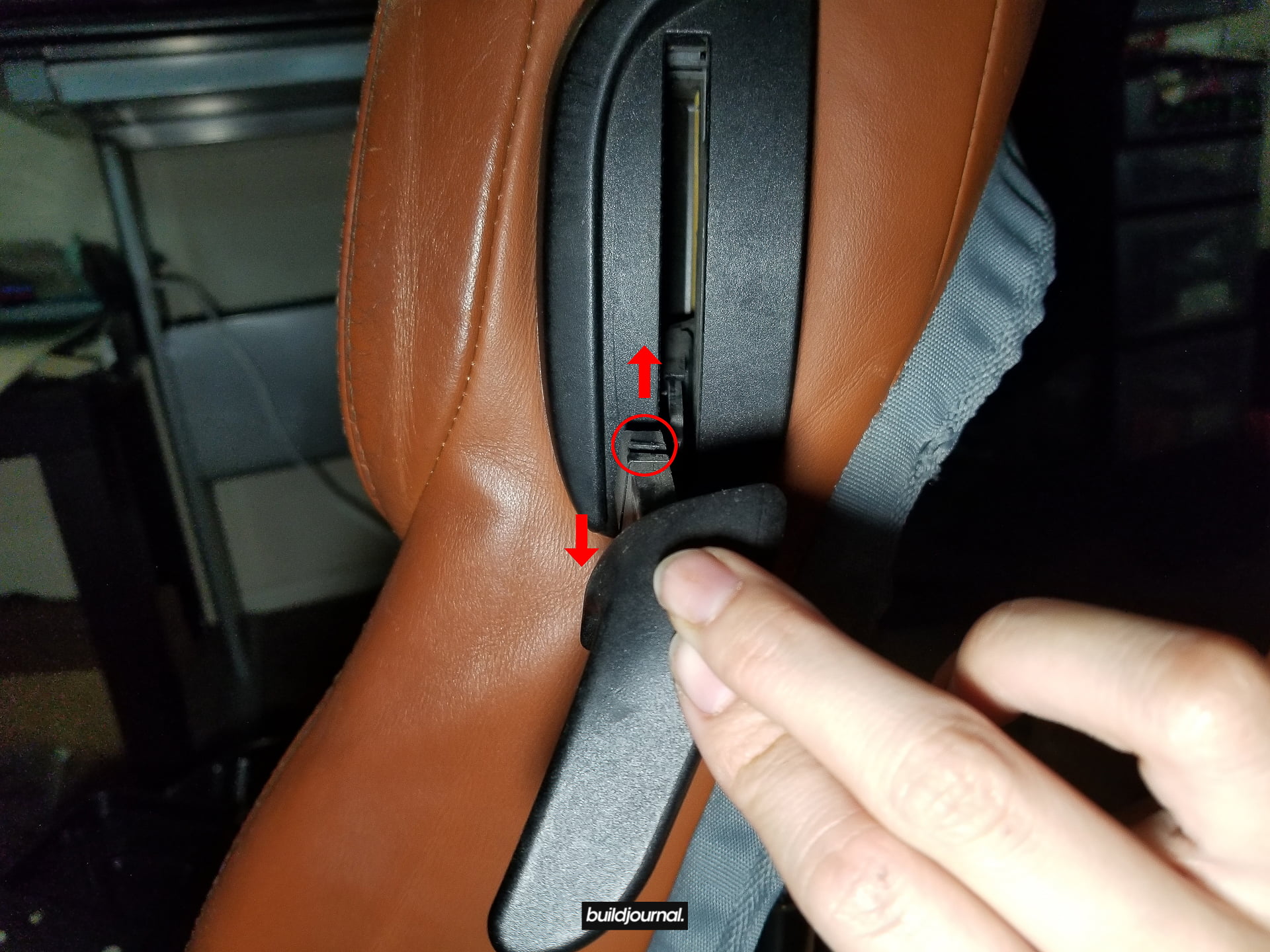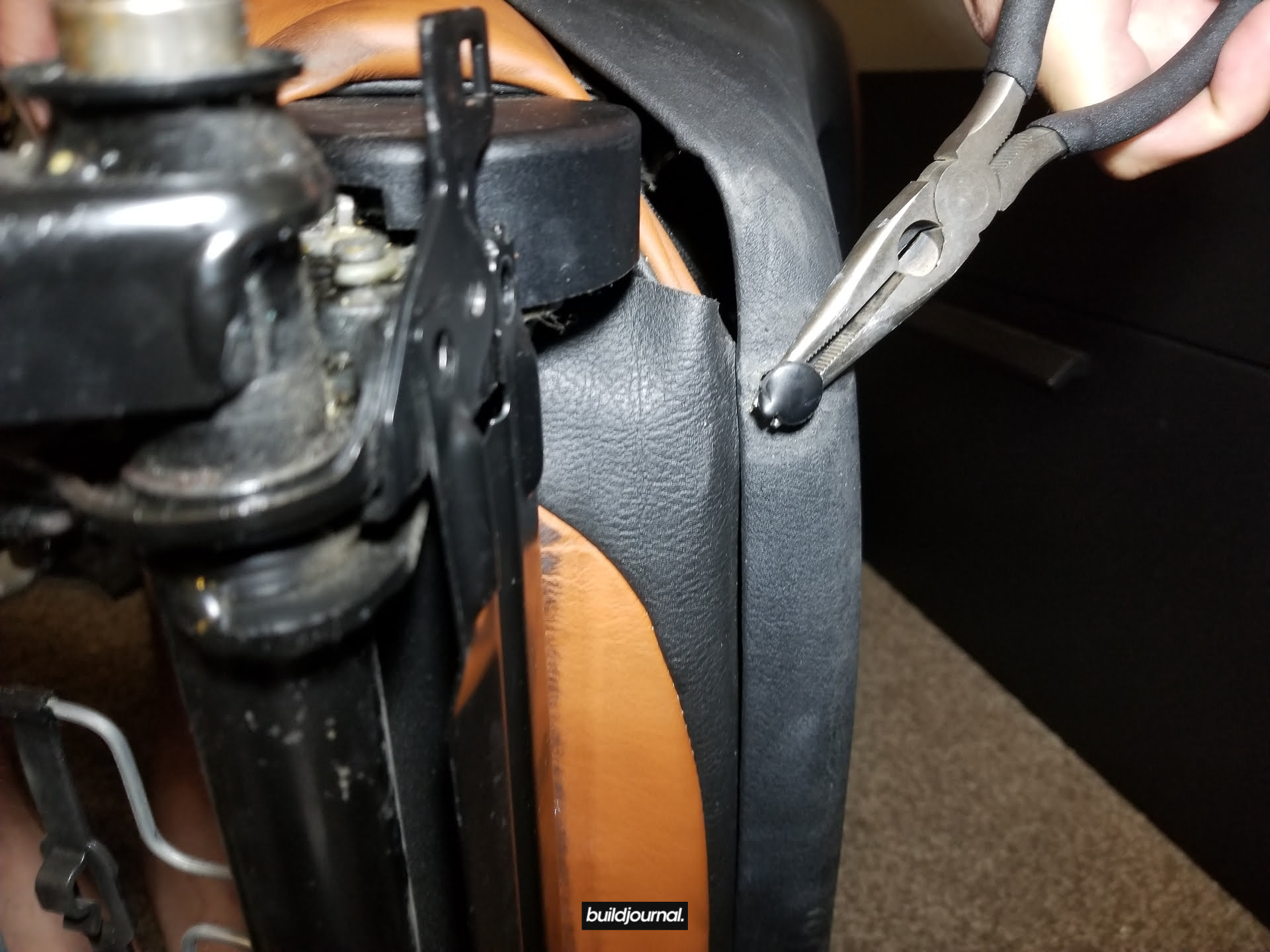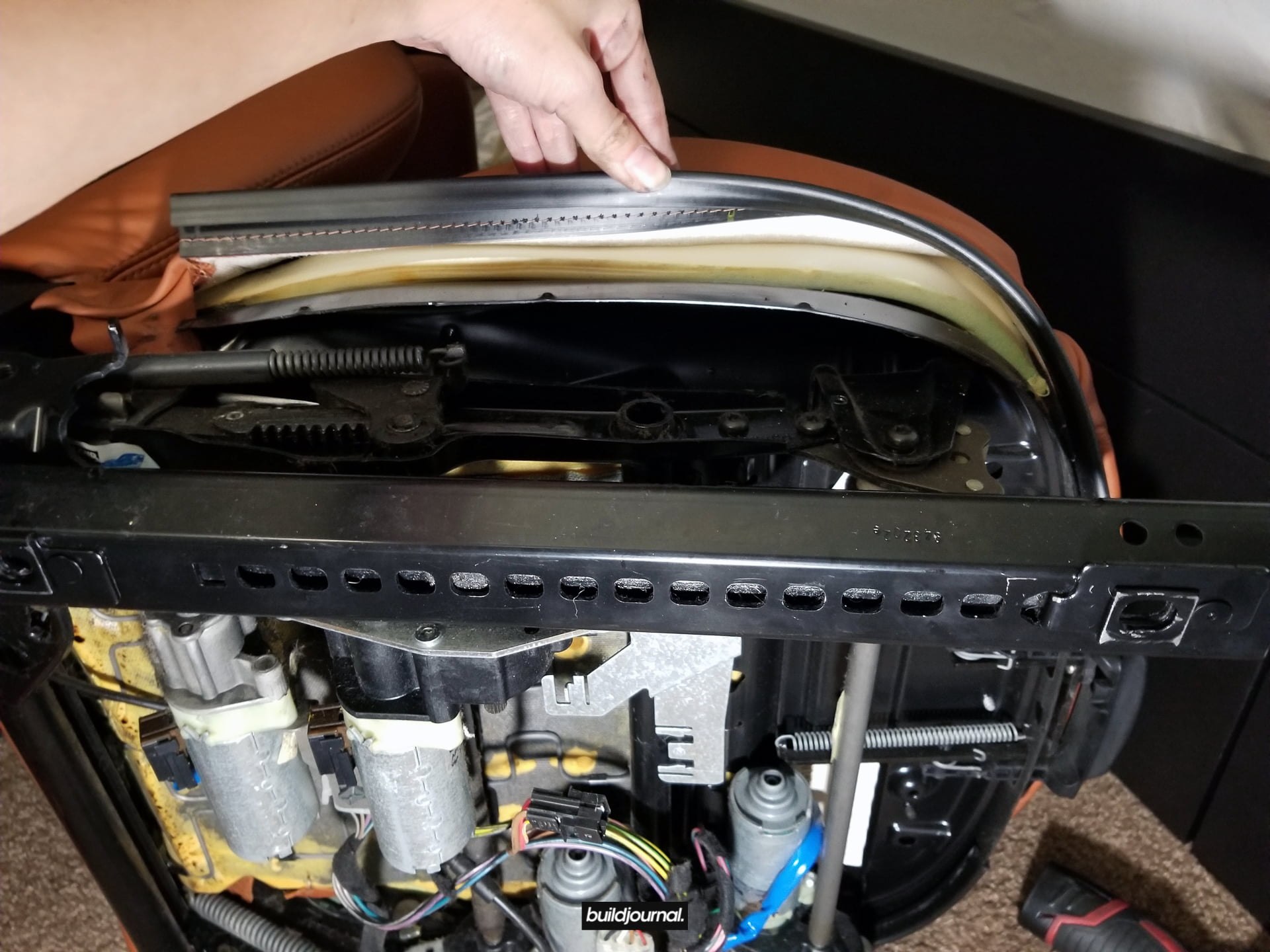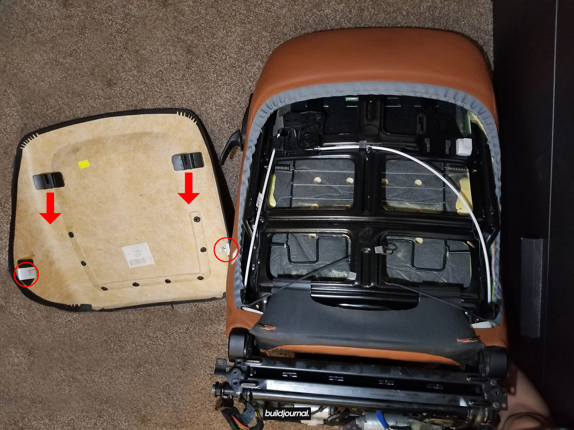 3.5 – Tuck in the back pieces through to the front under the bottom part of the backrest. If you have manual seats, you can tilt the seat forward to give yourself some more space to push the leather and foam out. From there, you can pull the whole bottom assembly off. (Video)