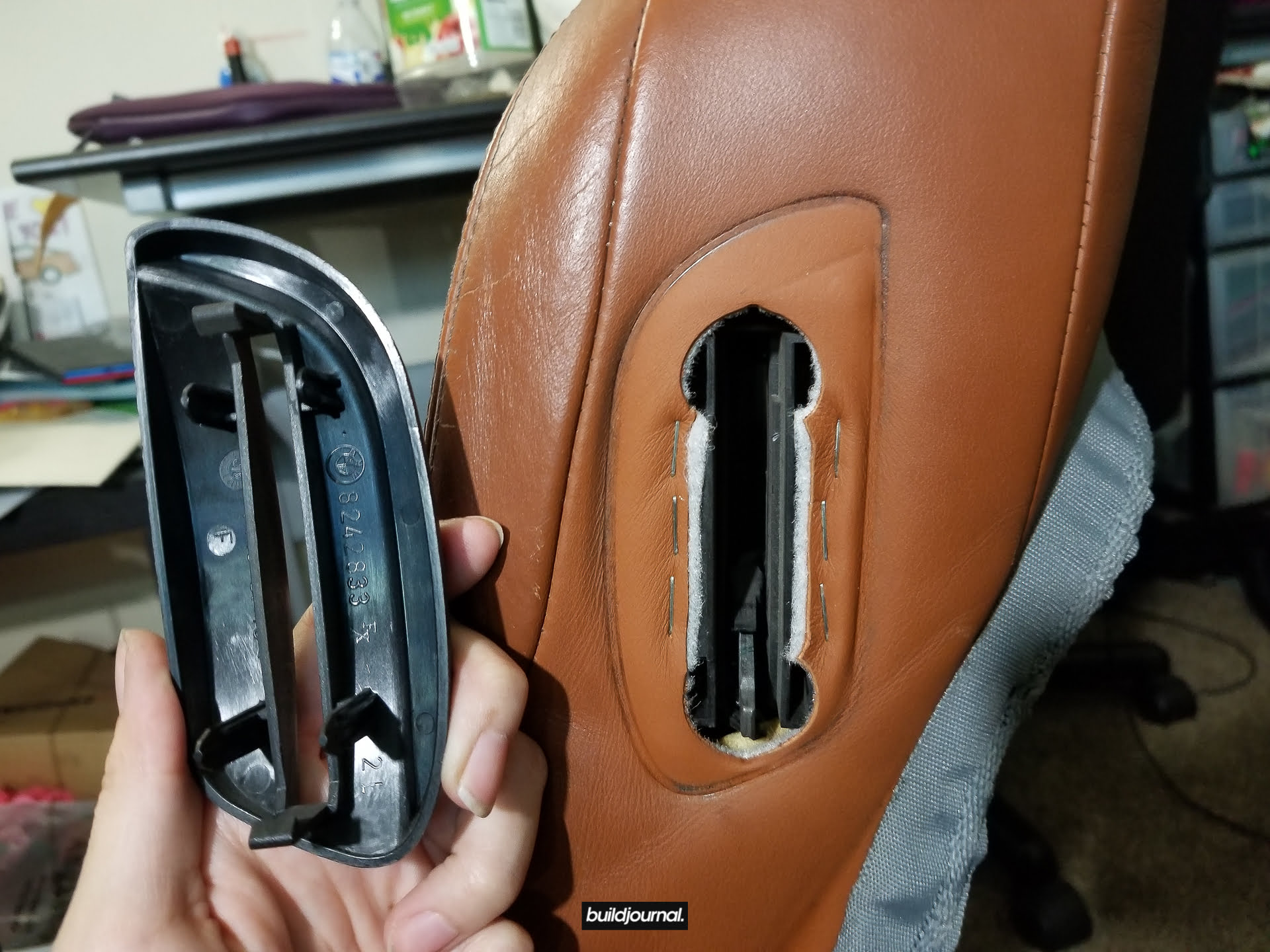 5.3 – Pry out the leather surrounding the headrest inserts.