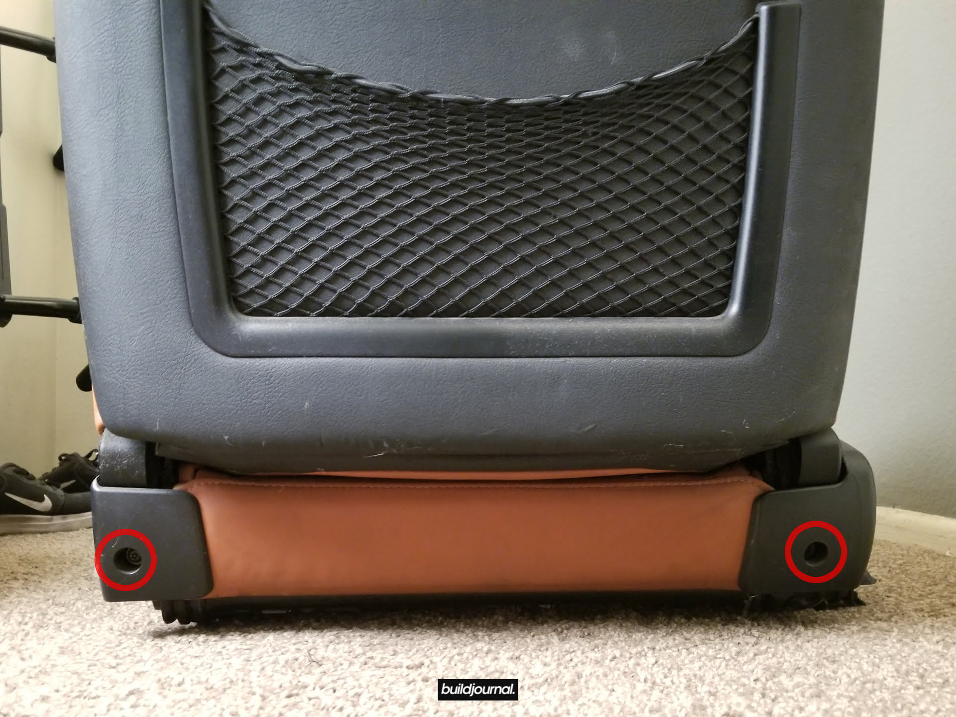 1.1 – There are two bolts and two nuts on your seat frame holding your seat to the chassis. Remove the caps if you have any. You will need to move your seat forward and backward to access them.