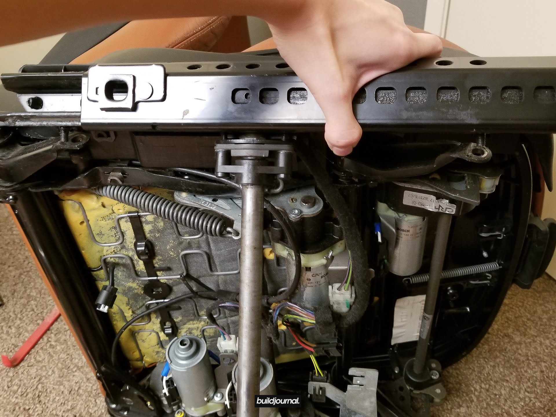 2.2 – Remove the two 10mm nuts on the seat base. Once removed, you will be able to pull off the slider. The center pole will also come out altogether like a T. (This is not a required step and the 50sKid did not do this, but I found that it was much easier to work around the seat and access the tabs/bolts.) Note that this seat is a power seat, manual seats are a little more mechanical and there are more levers, but the process is the same.