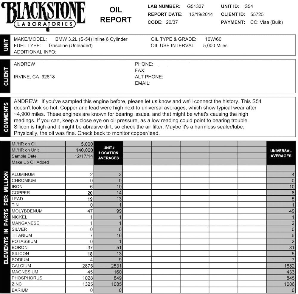 Case #2: Here is an oil sample analysis for my car which has about 100k miles worth of driving on the bearings. Bearing recall was performed around 40k miles. The first oil sample analysis was done at 140k miles and reports indicated higher than average copper wear which means the rod bearings were wearing. Copper is at 20 compared to an average of 14. Casey at RaceWerkz recommended performing frequent oil changes and to continue monitoring oil samples using Blackstone.